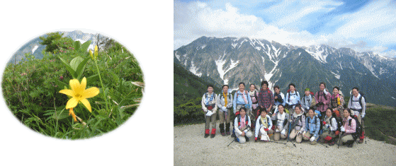 八方池山荘に着き、真っ白い雪渓が美しい北アルプスの大パノラマにみんなで感動し、いよいよスタートです。