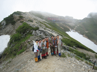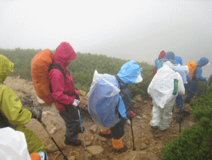 バラバラと叩きつける雨の音を聞きながら、時々吹きつける強い風に身を屈め、ゆっくりゆっくりと下ります。 とってもラッキーなことに、途中で雪渓を渡る3羽の雷鳥に出会いました。親子かな~と思いながら、息をひそめてじっと見つめていました。特別天然記念物の雷鳥をこんなに間近で見られるなんて……思いがけないプレゼントにみんな大感激です。ついつい見とれて写真を撮るのを忘れてしまいましたが、丸々としたかわいい姿は今でもくっきりと目に焼きついています。