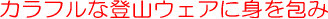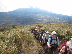 大自然の美しさは、心をリフレッシュしてくれる最高の清涼剤です。元気になって、頂上を目指して出発。大きくそびえ立つ富士山を背に、笹の原を色とりどりのリュックが続きます。