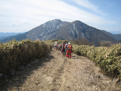 次に、富士山を正面に望む“石仏展望台”で小休止。見上げれば、ジグザグに“つづら折れ”の急坂が見えます。笹の原を黙々と登り、北面登山道分岐で振り向けば、さっきの“石仏展望台”がはるか後方に……まるで豆つぶのようです。目に映る景色は、富士山の麓に広がる“朝霧高原”や“青木ヶ原の樹海”、遠くには雪をかぶった“八ヶ岳” ここまでくればあと少し、どこまでも続く絶景とお弁当(♪)を楽しみに頂上を目指します。