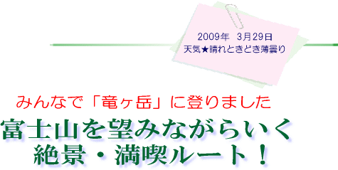 私たちの共通の趣味となった山登りは、3年目になります。今回は、山梨県の「竜ヶ岳(標高1485m)」を目指しました。竜ヶ岳は、富士山の西隣にある山で、千円札裏の富士山の右手に描かれています。その昔、“小富士”と呼ばれていましたが、噴火した富士山の溶岩で本栖湖が煮えたぎり、その熱さに耐えきれず、湖の主であった竜が“小富士”に駆け上ったという伝説から、「竜ヶ岳」と名がついたといわれています。