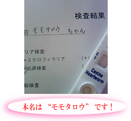 しばらくして診察の順番が回ってきました。 すごく怖い顔をした男性の獣医さんが、とってもやさしい声で「モモタローちゃ~ん」と呼びます。実はタローの正式の名前は“モモタロウ”なのです! 保健所には「桃太郎」と登録されていて、犬小屋の表札も「桃太郎」となっています。元の飼い主のおじいさんが“マリちゃん”と名づけていたことは、以前お話しましたが、私たちがタローと名づける前、近所の人たちはタローを「モモちゃん」と呼んで、少女のようにかわいがっていました。そこで“モモちゃん”と“タロー”を合わせて「桃太郎」と命名こうしてやさしい少女は、悪い鬼を退治する勇ましい「桃太郎」に変身したのです。