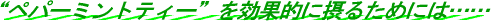 ペパーミント特有の、すっきりと爽やかな味と香りの濃いものを選ぶことがポイントです。少々値段がはっても品質の良いものなら、それだけ効果を期待できます。1日に2~4杯くらい摂ってください。入れたてのペパーミントティーが一番おいしくて薬効成分も豊富に含まれていますが、保温性のある携帯ボトルに“温かいペパーミントティー”を入れておけば、いつでも手軽に摂ることができます。