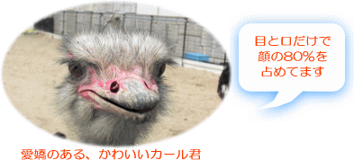 私たちはさっそく、その中のハンサムな黒色巻き毛のダチョウに“カール君”と名付けました。カール君の特徴は愛らしい大きな眼とカールしたふさふさな羽根、細くてもたくましい足です。クリッとした大きな眼には羨ましいほどの長~いまつ毛が生え、とってもキュート。まつ毛といえば、若い女性たちの間で何枚もの付けまつ毛をするのが流行っていますが、中にはとうてい似合っているとは言えないような人もいます。でも、こちらは正真正銘の“本物”。やはり本物にはかないません。