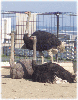 そこは、目の前一面に太平洋が広がるとっても見晴らしのいい場所で、おでんや焼き鳥などの売店があり、バーベキューもできる海の家です。その一角に、高さ1.7mほどのフェンスに囲まれた檻があり、その中にダチョウが4羽、自由に動き回っていました。