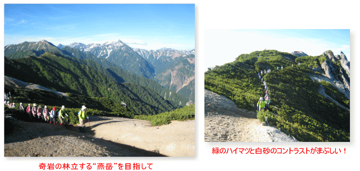 燕山荘からは360°のダイナミックな展望が楽しめます。近くには槍ヶ岳・穂高連峰、遠くには立山など北アルプスの大パノラマと残雪のゼブラ模様の稜線 「こんなに見事な絶景は初めて!」とみんな大感激。さらに目の前にはドーンとそびえる “燕岳” ハイマツの緑と白い花崗岩の岩肌のコントラストがとっても美しく、自然が織り成す美を心ゆくまで満喫しました。