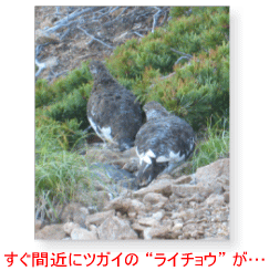 燕岳を下山し、次はゲーロ岩まで北アルプス“表銀座コース”を少しだけ縦走しました。その途中で2羽の“ライチョウ”を発見! 手が届きそうなほど近くで見たのは初めてです。白い羽根を少し残したまだら模様の丸々と太った姿がとっても愛らしく 「こんなに真近に見られるなんて、とってもラッキー!」と、みんな大感激です。驚かせないようにそーっとそーっと通り過ぎました。