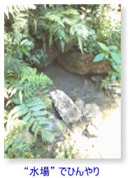 頂上から下り山の中腹の道を回って健康フレンドに戻りますが、その途中に洗面器ほどの小さな水場(手洗い場) があります。3年前にスタッフの一人が“湧き水”のまわりを掘り、小石を並べてつくったものです。暑くなるとタローは決まってその“水場”で喉を潤します。
