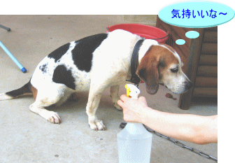 「霧吹きで体中に水を吹きつけ冷やそう!」というアイディアです。( ※人間と違って汗腺のない犬は暑さに弱く、しばしば熱中症になります。スタッフ考案の“霧吹き”は、犬の熱中症対策としてかなり効果があると思われます。)