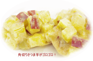 それにしても”鬼まんじゅう“とはなんとも恐ろしいネーミング「いったいどんな具が入ったまんじゅうなの?」 と思われることでしょう。普通まんじゅうというと、中にあんこが入っている丸いものを想像しますが、“鬼まんじゅう”はそれとはちょっと形が違います。フカフカの蒸しパンの上にさつま芋の角切りをトッピングしたようなものでもありません。薄力粉と砂糖を混ぜ合わせた生地に、角切りのさつま芋を加えて蒸すだけのいたって素朴なお菓子です。主役はさつま芋で、小麦粉はあくまでつなぎです。その表面がごつごつして鬼の角やこん棒を連想させるところから、 “鬼まんじゅう”と名づけられました。