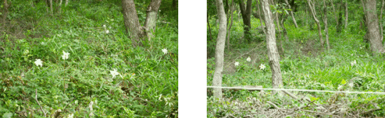 “ササユリの里”から戻ってきた私たちは、その足で裏山の群生地に直行。適度に湿り気のある明るい南斜面は、“ササユリの里”にそっくりです。「ひょっとしたら、私たちの裏山が第二の“ササユリの里”になるかもしれない」そんな予感で、みんなの期待は大きく膨らみました。