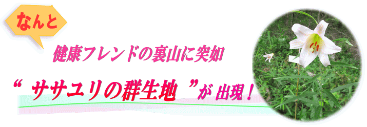 日に日に暑くなり、健康フレンドの裏山もすっかり夏山に変身しています。季節ごとに変わる自然の風景は、私たちの心を癒してくれます。とくに新緑がまぶしい春から初夏にかけては、一年のうちで最もさわやかな季節です。スタッフにとって、この時期に“ササユリ”を探しながら裏山を歩くのが楽しみの一つです。笹原の中に可憐な淡いピンク色の花を見つけると、その日はちょっと得した気分になります。