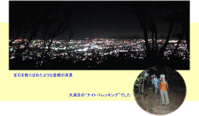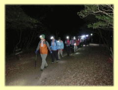 “ナイト・トレッキング”は、昼間と違って足元が見えにくいために転んだり、道に迷ったりする危険性が高く、昼間のトレッキングよりハイレベルだと言われています。“ナイト・トレッキング”の基本は、慣れた山道を選ぶこと。そこで私たちは、訓練のために毎年数回登っている地元の“湖西連峰”を選びました。“梅田親水公園”を出発し、“神石山(325m)”から“二川NHK中継所”を経由して、フレンドの裏山“東山(258m)”までの縦走コース。どんな夜景に出会えるのか、初めての体験にみんなワクワクしていました。