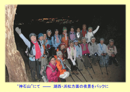 そこから“神石山”への道はかなりの急登、滑らないように気をつけて登ります。暗がりの中に大きくそびえる“獅子岩”を過ぎて7時10分、“神石山”頂上に到着。湖西市と浜松市の夜景が一面に広がり、その美しさに思わず息をのみます。ヘッドライトの明かりを落とし、キラキラと輝く見事な夜景にみんなうっとり、「きれいねぇ」の連発。遠くに浜松市のシンボル“アクトタワー”も見え、夜空を見上げると、オリオン座をはじめたくさんの星がまたたいていました。「星もきれい!」と大興奮、しばらくじっと見つめていました。