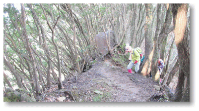 再出発してまもなく、“城山峠”に到着。ここから山頂まで“ウバメガシ”の群生が続いています。“ウバメガシ”は備長炭になる堅い木ですが、見た目は細く、幹には縦に独特のひび割れ模様が入っています。これほど広範囲にわたる“ウバメガシ”を見たのは、みんな初めて。薄暗い林に陽の光が差し込んで、「まるでグリム童話の世界に入り込んだよう」と、幻想的な風景を味わいながら登っていきます。
