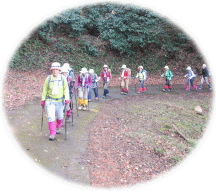 9時20分、最初の目的地“城山”山頂に到着。山頂からは大仁町の町並みや蛇行している狩野川、箱根の山々が望め、「きれい!」 と歓声。山頂にある方位盤でずっと以前に登った“金時山”を確認すると、「あの時飲んだ甘酒は、おいしかったわね」と、思い出話に花が咲きました。楽しみにしていた富士山は雲の中、次の山に期待して“城山”山頂を後にしました。