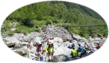 1時50分、“涸沢ヒュッテ”に戻ってきました。預けておいたザックを背負い、今度は“横尾山荘”を目指して一気に下っていきます。登ってきた道をどんどん下り、2時間ほどで“本谷橋”に到着。登山者の姿はなく、河原を独り占め。汗ばんだ体を冷まし、再び出発。足がだんだん重くなり、「あと少し、あと少し」と気力を振り絞って歩き続けます。「お風呂が待っているから頑張って!」という掛け声に、疲れた顔から笑い声がこぼれます。足は棒、もう一歩も歩きたくないと思った瞬間、目の前に“横尾大橋”が見え、「やっと着いた~」と安堵の声があがりました。