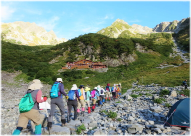 11時45分、沢の音が一段と大きくなると“本谷橋”に到着。多くの登山者が涼をとっていました。私たちもさっそく冷たい川の水で手を洗ったり、顔や首を拭いて、ほてった体を冷まします。清流と吊り橋、緑に囲まれたこの場所は、最高の休憩所です。ここから本格的な登り坂、岩の登山道を足元に注意しながら登っていきます。すると突然、先頭を行くスタッフの「“涸沢” よ!」という声、目標が見えてきました。容赦なく照りつける日差しに汗が滝のように流れ、水分補給をこまめにします。歩幅は狭く、深呼吸をしながらゆっくりゆっくりと登っていきます。上の方に“涸沢ヒュッテ”の吹流しが見え、「もうひと踏ん張り!」と激励が飛びます。一歩一歩踏みしめながら必死に登っていきます。赤や緑の実をつけた“ナナカマド”の群生を越え、14時10分、やっと“涸沢ヒュッテ”に到着しました。