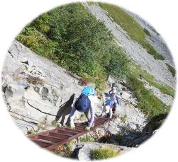 取付点では、最初は鎖場 傾斜40度ほどの一枚岩に長い鎖が取り付けられています。足をかける所を探しながら右手は岩を、左手は鎖をつかんで「ヨイショ!」と登っていきます。鎖場を登り切ると次は梯子 傾斜60度ほどの岩場に短い梯子と長い梯子が取り付けられていて、スリル満点。梯子をしっかりとつかみ、慎重に登っていきます。それを登り切ると、真横に2年前に登った“ザイテングラート”が見え、“奥穂高岳” が一望できます。