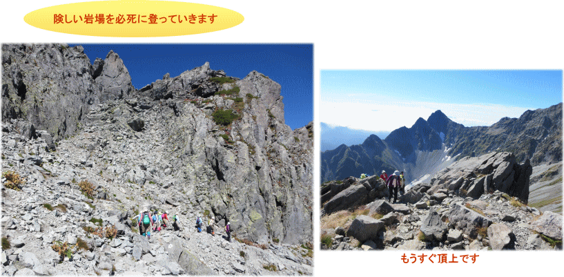 翌朝6時30分、絶好の登山日和です。朝焼けに輝く山頂を眺め、「さぁ、行くぞ!」と気合を入れて出発。カラフルなテント場を通り抜け、急な坂を登っていきます。20分ほどで体が暑くなり、衣類を調整。真っ赤に実ったナナカマドの群生を横に、岩がゴロゴロした道をひたすら登っていきます。振り返ると “涸沢ヒュッテ” が小さくなり、高い所まで登ってきたことを実感。登っていくにしたがい、大きな雪渓とそれを囲んでいる穂高岳の峰々がどんどん目の前に迫ってきます。そして遠くの山々まで一望できるようになりました。険しい岩場が続く登りではストックをしまい、両手でしっかりと岩をつかんで登ります。