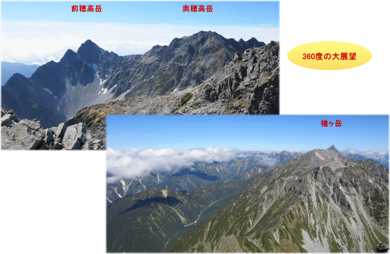 9時45分、ついに“北穂高岳”山頂に到着。みんな「ヤッター!」と、両手をあげて歓声。山頂は360度の大パノラマ 北方向には大キレットの先に“槍ヶ岳”の雄姿がドーンと迫り、南方向には荒々しい穂高連峰、すぐそばには思わず息をのむほど鋭く尖った絶壁。雲ひとつない青空が峰々をくっきりと映し出し、最高級の大展望に言葉を失うほど。ただただじっと、その感動に浸っていました。