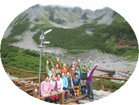 2時15分、やっと全員登頂に成功! 山頂には白山比咩(しろやまひめ)神社の奥宮があり、大勢の登山者が写真を撮ったり、景色を眺めたりしていました。眼下には、山小屋の赤い屋根と群生するハイマツの緑、そして噴火口の内側を思わせるような大小の岩がころがっている荒涼とした風景が広がっています。すぐ下を見ると、すさまじい噴火の後をしのばせる火口湖がいくつもあり、そばにはまだ雪が残っていました。その真っ白い雪と火口湖の深いブルーのコントラストが何とも美しく、「こんな景色は今まで見たことがない!」 と、みんな歓声を上げました。