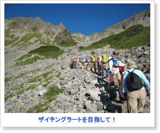 午前5時30分、“平瀬道登山口” に到着。清々しい空気を感じながら念入りに準備運動をし、みんなで記念撮影。「ようこそ白山国立公園へ」 と書かれたゲートをくぐり、鮮やかな緑の木々の中を、いざ出発! 下見をしたメンバーの話では、「御前峰まではずっと登り坂。標高差は約1500mあるが、それほどきつくない」 とのこと。しかしこの暑さですから、そんなに甘くはありません。まずは、山小屋のある “室堂” を目指します。途中、「室堂まであと3時間ね」 などと確認し合いながら、気合を入れます。今回は水を補給するところがないので、リュックの中にはペットボトルが4本(2リットル)、背中にズッシリと重みがかかります。