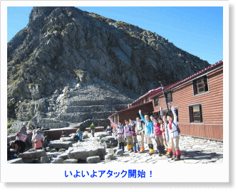 ゴロゴロとした石の急登を必死に登っていくと、突然目の前が開けて、昔の学校のような大きな山小屋の赤い屋根が目に飛び込んできました。室堂まであと500m、赤い実をつけたハイマツの木々の中を進み、11時20分、全員無事に “室堂ビジターセンター” に到着。思わず 「ヤッター!」 と、安堵の声が上がりました。