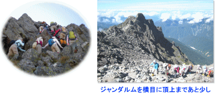 10時、目の前に大きな雪渓が現れました。気を抜けばどこまでも滑り落ちてしまいそうな急な斜面に、思わず息をのみます。幸いにも、そこでは地元の青年2人が登山者のためにロープを張って介助してくれました。ボランティアでしているのでしょうか、2人に感謝しながら慎重に渡りました。