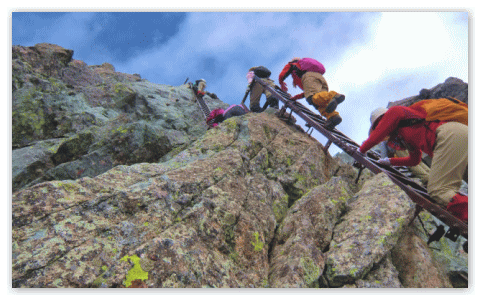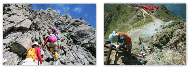 11時50分、アタック開始。両手で岩をつかんでは慎重に足場を探しながら登ります。「ヨイショ!」という掛声とともに、「キャー、どこに足をかければいいの~」といった悲鳴にも似た声が聞こえてきます。岩壁につけられた鎖を必死に握りしめ足掛かりを探しながらよじ登ったり、垂直の鉄の梯子を何度も登ったりと、スリル満点。ふと振り返ると、恐ろしいほどの絶壁、思わず息をのみ、手に力が入ります。最後に長い梯子を登り切ると、頂上です。次々に「ヤッター!」と歓声があがります。