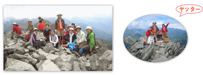 12時20分、全員登頂に成功。こんなに険しいところにも祠があるなんて驚きです。頂上は360度の大パノラマ 少しガスが掛かっていて遠くの山までは見えませんでしたが、周辺の“大喰岳”・“中岳”・“西岳”など、もちろん“常念岳”もくっきりときれいに見えました。下を見ると、“槍ヶ岳山荘”を中心に東鎌尾根(表銀座通り)から西鎌尾根(裏銀座通り)に続く一本の登山道がどこまでも続いています。木々の緑と硫黄岳の黄土色の山肌のコントラストが見事で、みんな口々に「きれいね~」と声をあげていました。景色を十分に堪能し、下山開始。登り以上に慎重に足元を確認しながらゆっくりと下ります。