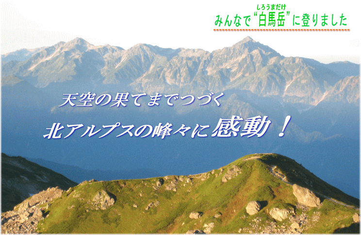 翌朝、今日も天気は快晴です。ゆっくり休んだおかげで体調は万全。6時30分、アタックザックを背負い“燕岳頂上”を目指します。朝の空気のすがすがしさを全身で感じ、コマクサの可憐な花を眺めたり、自然がつくり出した花崗岩の造形を見上げながら、ハイマツと白砂の道を登っていきました。最後に「ヨイショ!」とふんばって岩を登ると、頂上です。頂上は狭く4~5人しか立つことができませんが、頂上からの眺めはやっぱり最高です。真っ青な空とくっきりと連なる稜線・そしてたどってきた一本の道の先には赤い燕山荘 この景色をみんなしっかりと目に焼き付けました。