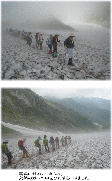 山では、すれ違う人と「こんにちは」とか「どちらからですか とあいさつを交わします。普段の生活の中では、出会う人みんなにあいさつをすれば“変な人”と警戒されてしまいますが、山ではそれが自然にできます。道を譲ったり譲られたり、登山ならではの“心の交流”があります。今回は連休の最終日ということですれ違う人が本当に多く、“燕岳”の人気の高さがうかがえました。中高年はもちろんのこと、若い人から子供連れの親子まで、大勢の人たちに出会いました。なかでも、特に若い女性たちが目につきました。『山ガール急増』という情報に納得です。カラフルなウェアにサポートタイツ姿、ファッションまでバッチリと決めていました。また以前は男性のタイツ姿はあまり見かけませんでしたが、今では当たり前の光景となり、登山者の様相も少しずつ変化しているのを感じました。若い人たちが自然を求めて、決して楽とはいえない登山に臨むのは、とても健康的でいいものです。